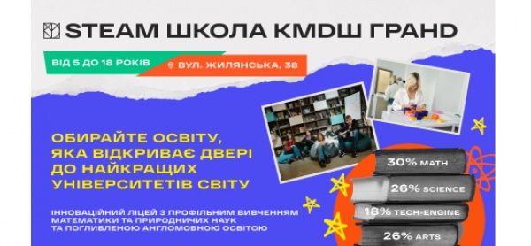 STEAM ШКОЛА KMDШ ГРАНD – це сучасна STEАМ-школа, де з метою підвищення ефективності навчання дітей використовуються міжнародні методики, авторські програми та курси.