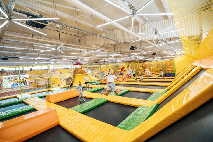 - величезна батутна арена зі стіною для скелелазання та поролонова яма для стрибків