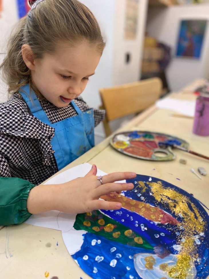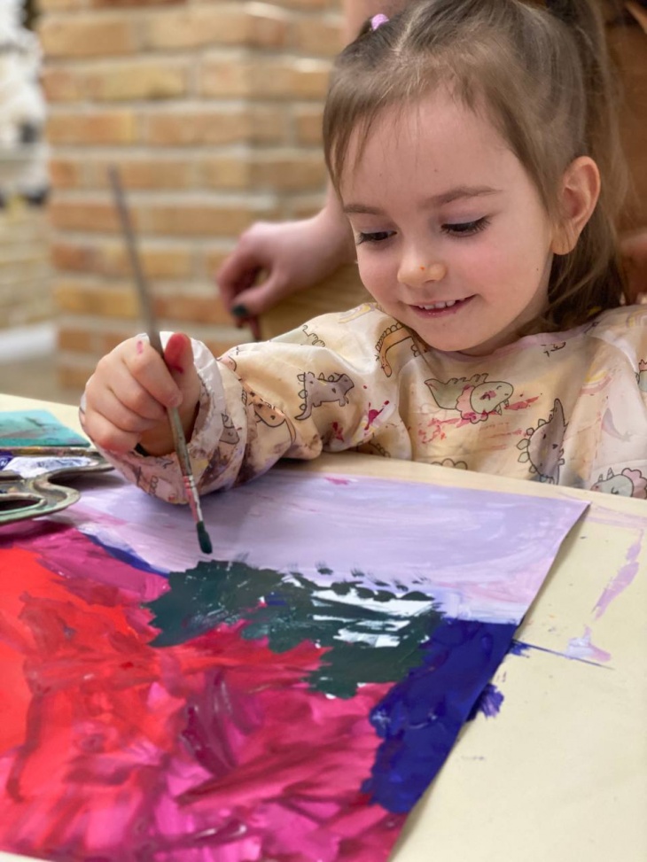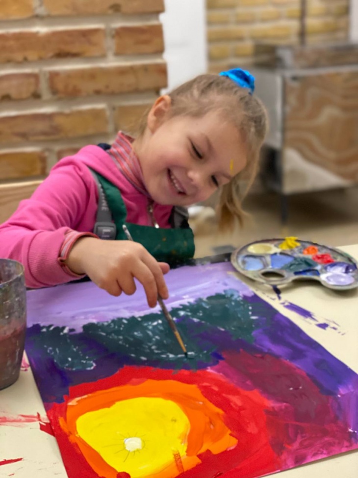 Діти засвоюють ази образотворчого мистецтва, вчаться вправлятися з пензликом, відчувати різні матеріали, отримують перші мистецькі знання про форми і кольори. Кожне заняття особливе і після кожного діти мають власноруч створені яскраві роботи.