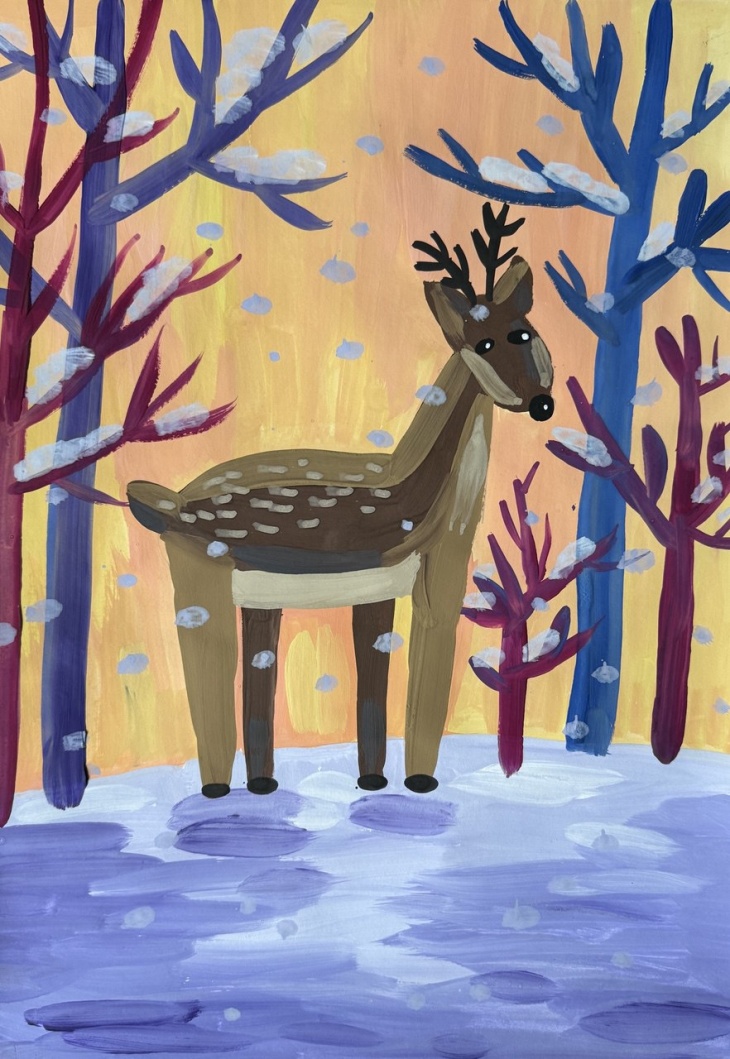 На занятті вчитимось передавати зимовий настрій за допомогою кольору, будемо розвивати уяву, відчуття композиції та інтерес до зображення природи й тварин.